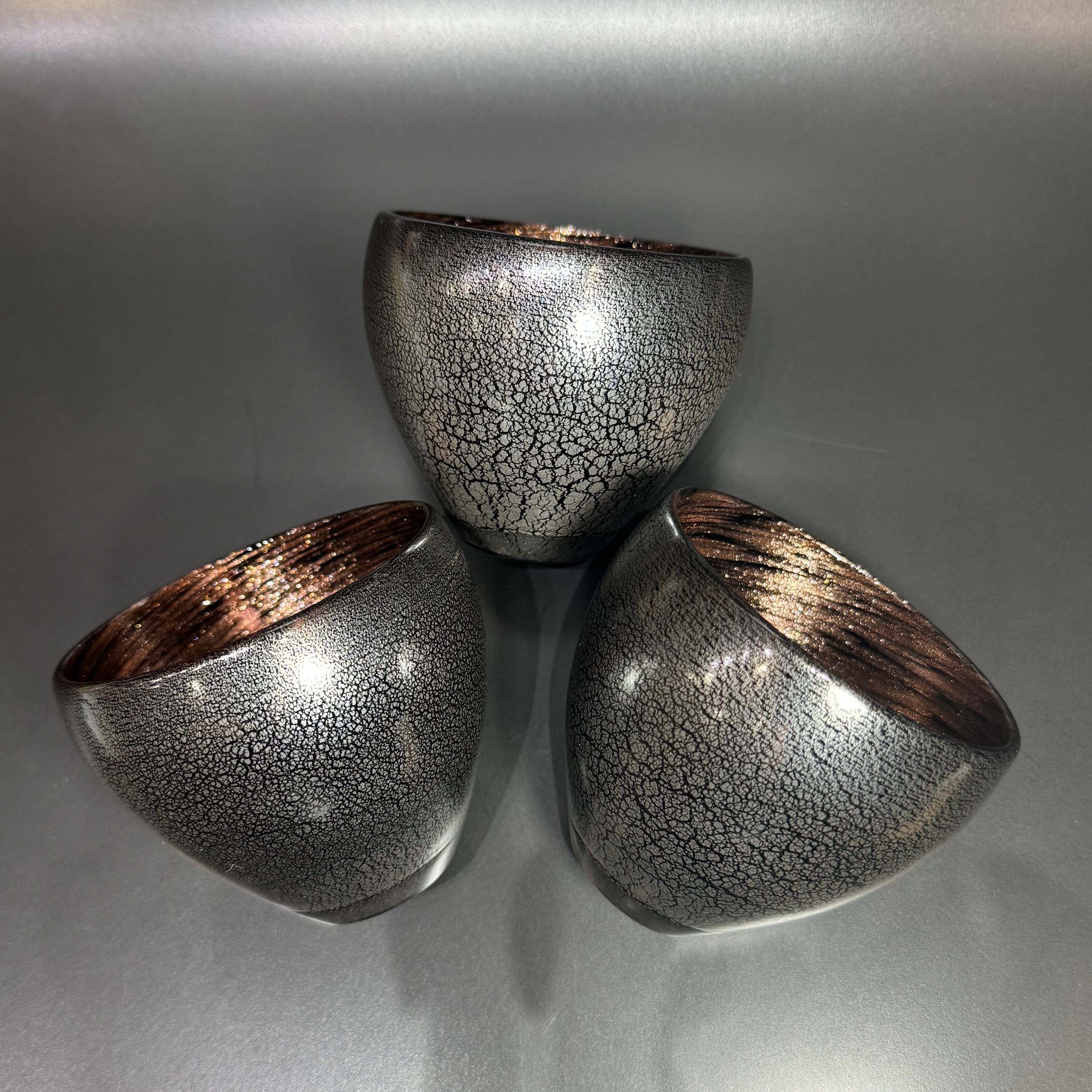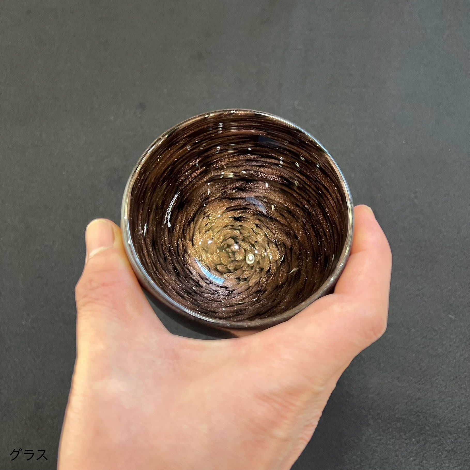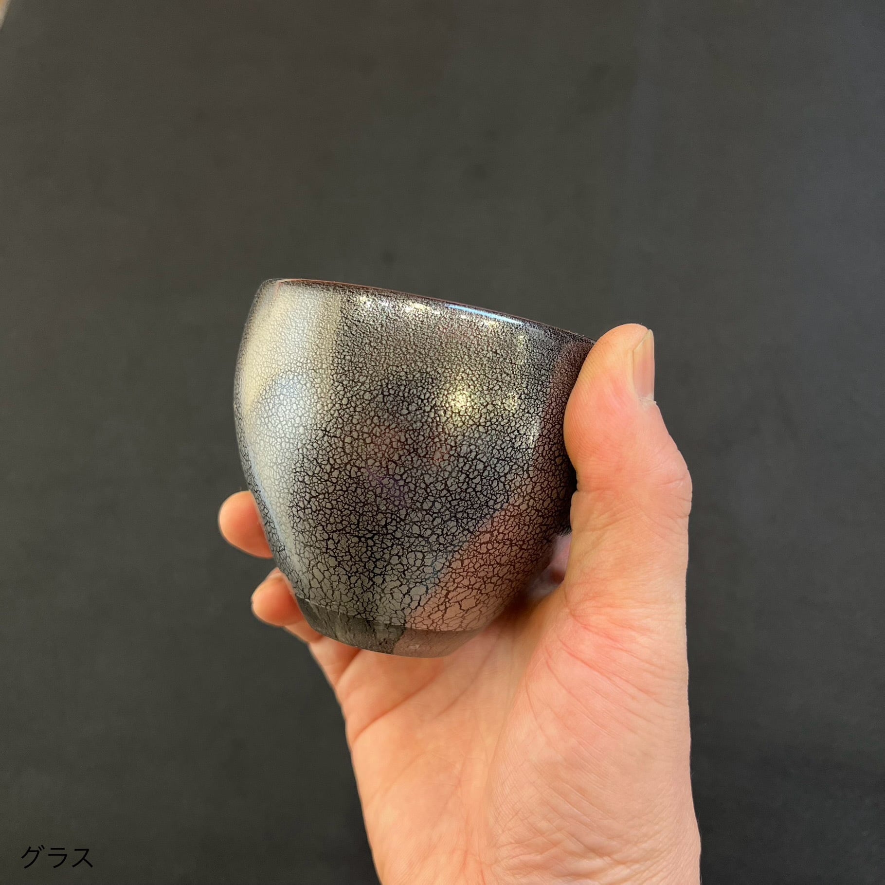 マットに仕上げた外側は、銀色のひび割れたような模様になっており、ガラスとも陶器ともまた違った手触りが特徴です。
