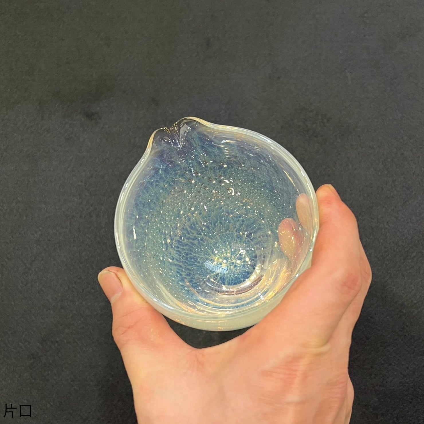 ぐい吞みは手の中に納まるサイズ感で、厚みのあるガラスが程よい重量感のぐい吞みです。