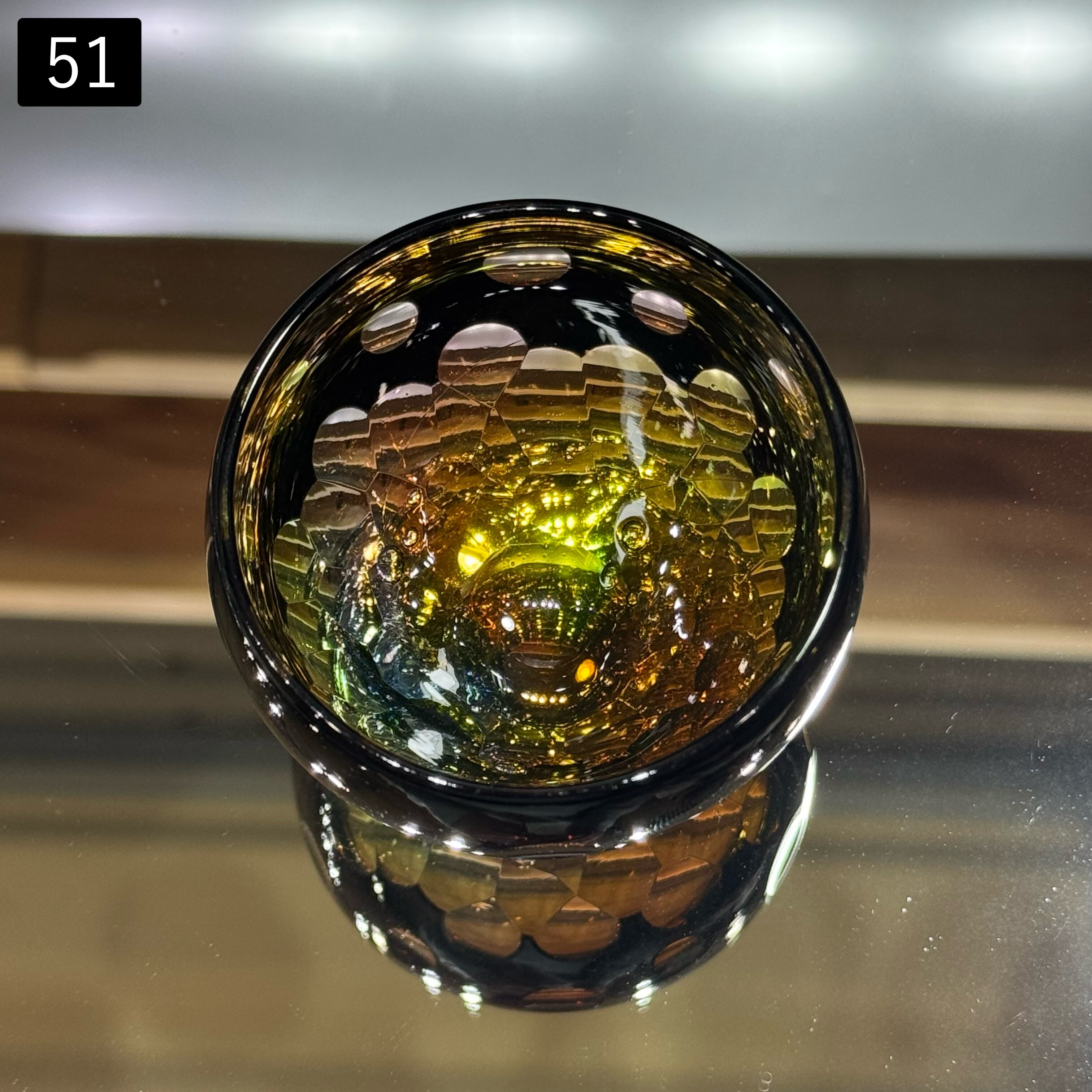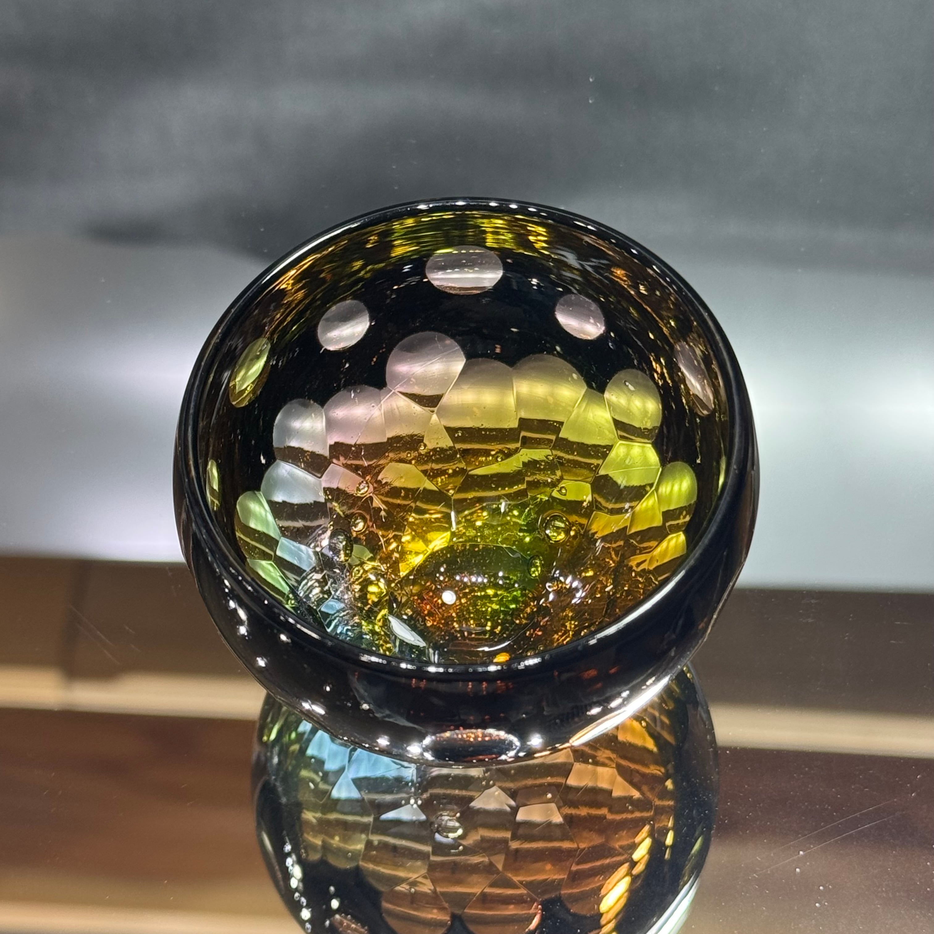 吹きガラスで器から制作し、ひとつひとつ丁寧に削って磨いて作り上げております。