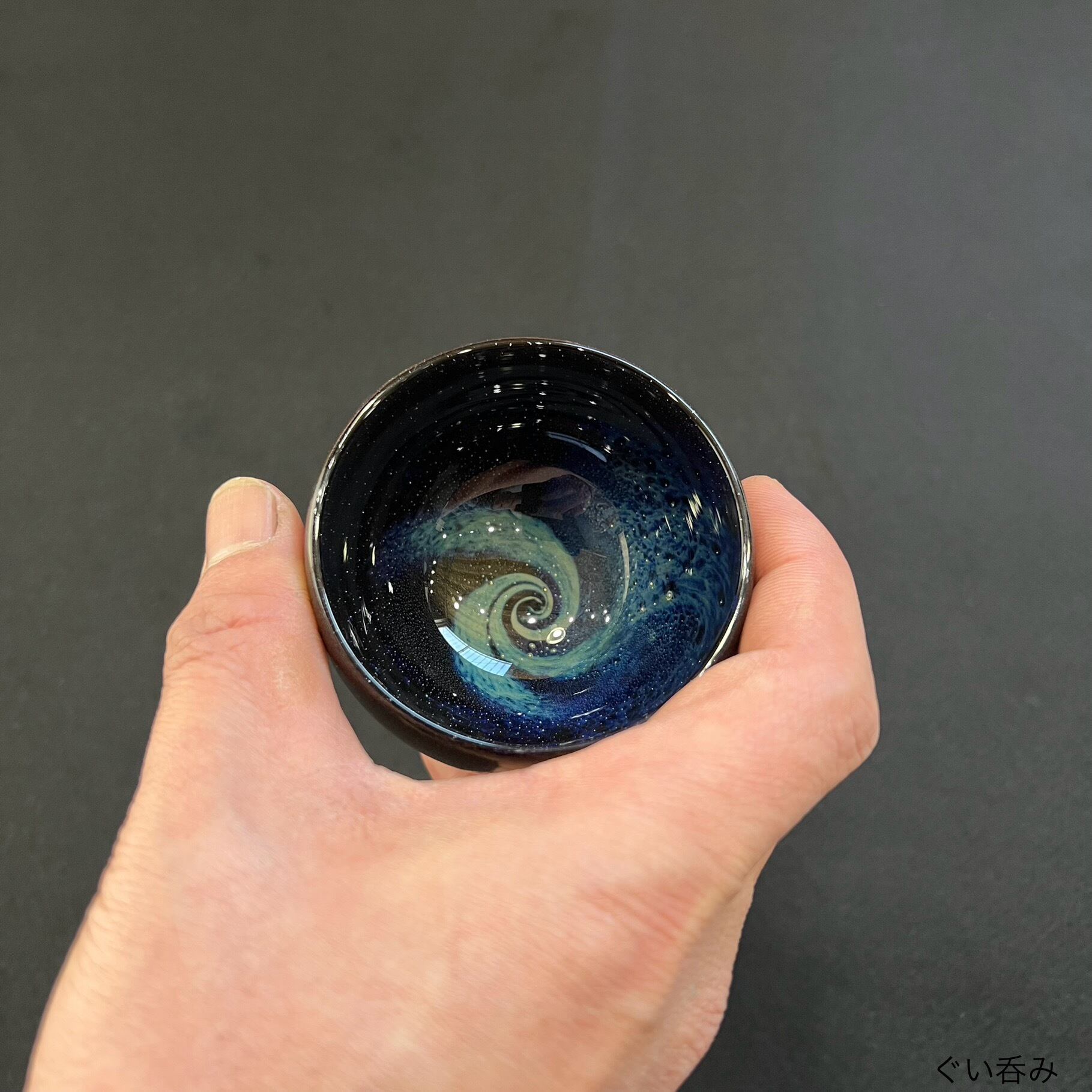 ぐい吞みは手の中に納まるサイズ感で、厚みのあるガラスが程よい重量感のぐい吞みです。